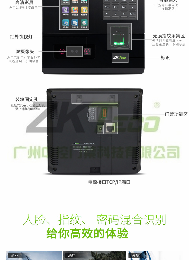 指紋打卡機UF200產品介紹: 1.歐式流線型設計,觸摸與微動按鍵并存,面部、密碼、指紋多種識別方式為一體,高品質、多功能的完美體現。 2.面部容量200張,指紋容量400枚。 3.TCP/IP、U盤通訊方式。 4.自助式考勤功能。