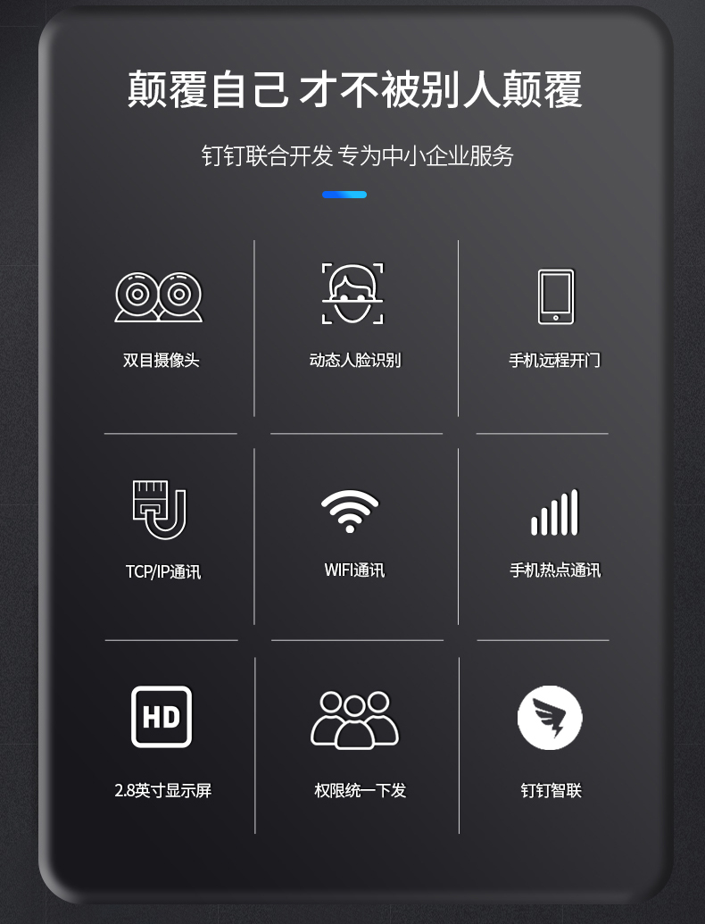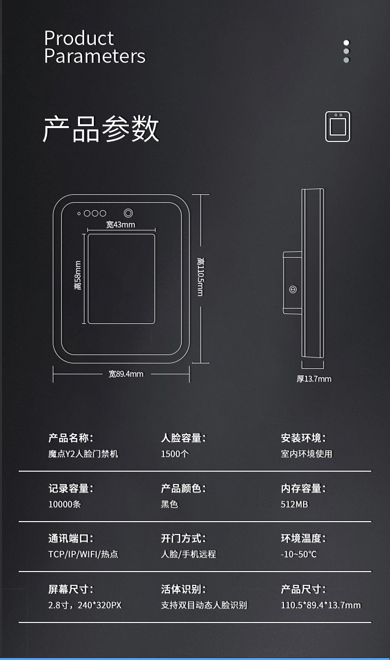 魔點Y2智能人臉考勤門禁搭載海思處理器和智能雙攝,配2.8寸觸摸屏,識別速度僅0.3秒,離線支持1500張人臉容量。 雙目合璧 活體防偽 采用混合光譜技術,活體防偽,抵御圖像攻擊 突破地域限制 跨區(qū)域考勤數(shù)據(jù)云端實時同步 考勤數(shù)據(jù)一鍵生成,手機可查,輕松便捷 出差,遲到、缺卡,各種出勤狀況清晰匯總 擺脫空間束縛 支持多場景安裝 玲瓏身材,支持玻璃、大理石、乳膠漆等多種墻面安裝,適配更多樣,使用更便捷
