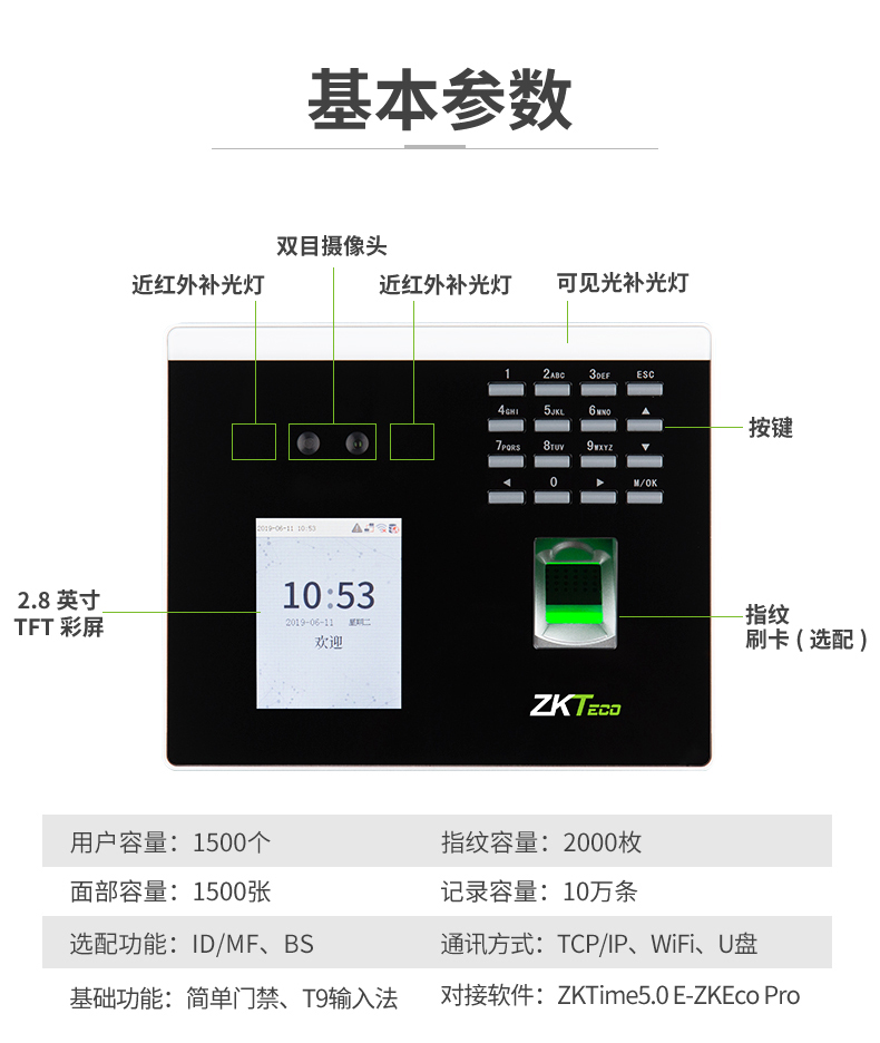 中控xface100 wifi無線人臉識別門禁是廣州中控全新推出的一款多光譜智能指紋面部考勤機,采用Linux操作系統,運用高性能人臉識別算法,0.5秒內快速識別。配置200萬高清雙目攝像頭,實現精準人員身份驗證。兼具門磁、報警、開鎖、出門開關等門禁管理功能,滿足大眾化需求,守護辦公環境安全,適用于酒店考勤、社區門禁等場景需求。此外,根據需求可進行精細化管理平臺定制,實現時間和安全的高效。 用戶容量1500個指紋容量2000枚面部容量1500張記錄容量10萬條顯示屏2.8寸彩屏通訊方式TCP/IP、WIFI基礎功能U盤功能、攝像頭、T9輸入法、記錄查詢使用溫度0℃~45℃使用濕度20%RH~80%RH電源規格DC12V/1.5A尺寸138*170*32.3mm